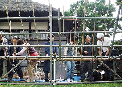 この建物は、戦前戦後を通じて、帝国銀行や東京通信工業(現・ソニー)の会長を務めた万代順四郎氏とトミ夫妻の邸宅だったもの。夫人他界後の昭和55年、横須賀市に寄贈された。その後、「万代会館」と名付けられ、市民施設として文化活動の場となっている。現在の所有者は横須賀市。庭や建物の維持管理と人件費に関しては、市が負担している(年額380万円/平成24年度)。修繕目的として、建物寄贈と同時に受けた寄付金を基金として取り崩して修理に充てており、財政面では厳しい状況だという。最も深刻なのは、茅葺きだけでなく内部も老朽化が進んでいること。現在は茅葺きの現場監督で大工の市川茂さん(川崎市在住)らを中心にボランティアで保全が行われている。しかし、個人の負担が年々増大。継続して行うためには、今後の施設の在り方を含めて検討しなければいけない時期に来ていると考え先月、地域住民などが集まり「万代会館プロジェクト・準備会」を発足。庭の手入れやペンキ塗りなどのワークショップや見学会を通じて「まずはこの施設を知ってもらいたい」と活動を始めている。