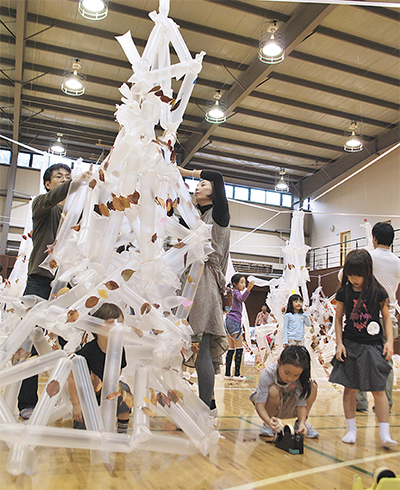 横浜美術大学による地域講座「親子で作る!秋色エアースカイツリー!」が今月3日に行われ、64人の親子が参加した。