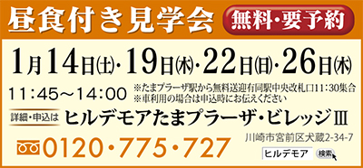 東京海上グループの介護付有料老人ホーム、ヒルデモアたまプラーザ・ビレッジIII(宮前区犬蔵)が1月14日(土)・19日(木)・22日(日)、26日(木)、無料昼食付き見学会を開く。11時45分〜14時。要予約。