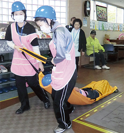 訓練では、夜間に火災が発生したという想定で、避難経路や搬送方法を確認。参加者らは入居者の手を取りながら、各部屋から誘導を行った。歩けない高齢者は、引きずって運ぶことができる担架を使用した。