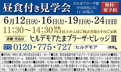 東京海上グループの元気な時から入れる自立型と介護型の有料老人ホームを一度に見学できる絶好のチャンス―宮前区犬蔵のヒルデモアたまプラーザ・ビレッジIII(自立型)が、昼食付き無料見学会を開催する。6月12日(火)・16日(土)・19日(火)・24日(日)の4回。午前11時30分たまプラーザ駅集合。要予約。各回先着15人。毎回、非常に人気の高い見学会なので予約はお早めに。