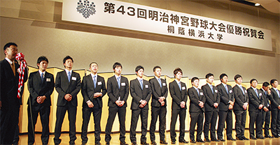 「第43回明治神宮野球大会」で県勢初の全国制覇を果たした桐蔭横浜大学(鉄町)硬式野球部は優勝祝賀会を1月31日、新横浜プリンスホテルで実施=写真。堀江武史副区長はじめ、県大学野球連盟関係者、保護者、OB、大学関係者、地元少年野球チームなど800人が出席し、同部の功績をたたえた。