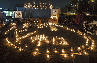 藤が丘駅前公園では9日、「横浜から鎮魂と希望の明かりを灯そう」と題し、キャンドルナイトが行われた。これは、藤が丘商店会メンバーらとともしびプロジェクト横浜with紫苑が中心となり開催されたもの。
