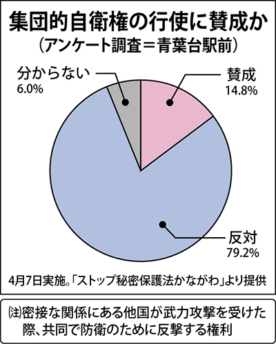 4月7日、県内で活動する「時を見つめる会」「ストップ秘密保護法かながわ」、区内で活動する「憲九会」のメンバーが青葉台駅前に立った。集団的自衛権の行使への賛否を無作為に尋ね、シールで投票を募った。284人のうち、賛成は42人、反対は225人、分からないと答えた人は17人だった(=表)。