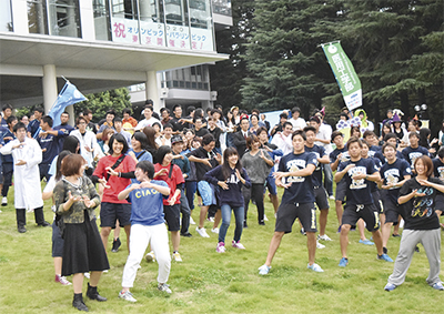 普段は立ち入り禁止の芝生エリアを開放し、さまざまな学部や部活動の団体が集結。200人以上が一斉に踊った。燦爛祭実行委員長の會田靖直さん(3年)は「各方面の協力があって実現できた。毎年このような企画ができれば」と笑顔を見せていた。