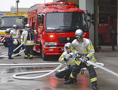 東名高速道路での同署の出動範囲は、下り車線の横浜青葉インターチェンジ(IC)から横浜町田ICまで。同区域の高速道路には消火栓がないため、同署では水槽付き消防車で出動するという。一度に運べる水量は1・5トンで、火災現場にはICからしか入れないのが素早い対応への課題だった。今回の訓練では水10トンを搭載できる散水車に、同署の消防車をつなげられるか検証したところ、放水に成功した。