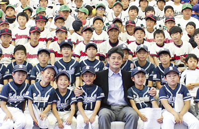 当日は、選手の肩や肘の状態をスポーツ整形外科の医師らがチェック。理学療法士によるストレッチ指導も行われ、選手は準備運動やアフターケアの大切さを学んだ。工藤監督は検診中の子どもに話しかけアドバイスも行っていた。また、工藤監督は選手に激励の言葉をかけ、最後には全員と記念撮影を行った=写真。