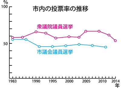 また4年前に行われた前回の市議会議員選挙の投票率を年代別に見ると、49歳以下の投票率が全体を引き下げており、20代は30%未満にとどまる。市選管の調査によると、投票に行かない理由は「どの候補者がよいかわからなかった」(30・2%)、「あまり関心がなかった」(15・1%)といったものが上位を占め、「地域社会との関わりの度合いが投票率に反映されているとも考えられる。地域に関心が向くことで、身近な地域の政治に対する関心も高まるのでは」(同担当者)という。