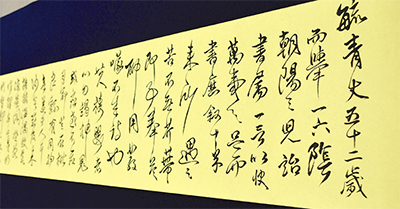 加賀さんの作品は中国の書道家、傅山の作品『行草五言古詩巻』を手本に書いた臨書。くずれた文字を織り混ぜた草書体の巻物は、3・5m以上に及ぶ。3枚の紙をつなげて制作し、全国大会には規定に合わせ自身の作品を短くして出展した。