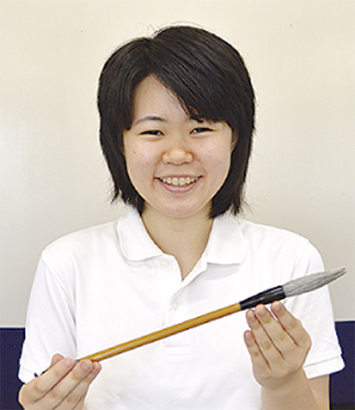 全国大会の常連校として知られる同校。小学2年生から中学2年生まで書道を習っていた加賀さんは、高校入学前に同校文化祭で、人の背丈以上ある大きな書道部の作品を見て、「先輩のように書いてみたい」と書道部への入部を決めた。現在は副部長を務め、「書道は色々な書体があり、好きな字を書けるのが魅力」と語る。