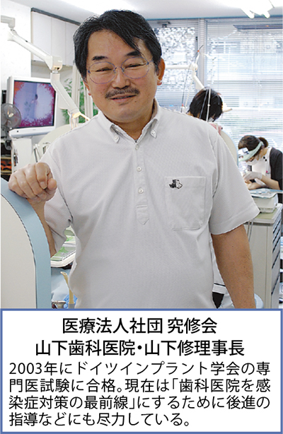 一般的な歯周病治療は通院回数が多く、治療期間も数カ月と長くなり、患者の負担も多いのが実状。山下歯科医院(藤が丘)の山下修理事長は、除菌水とレーザー機器を駆使した、最短1日で終わるという歯周病治療を行っている。山下理事長が提唱する独自の方法(※保険外診療)について話を聞いた。
