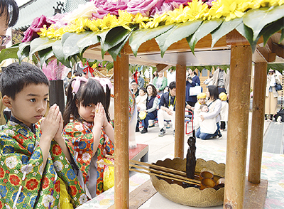 役目を果たした2人は「緊張した」「(衣装が)かっこよくて楽しかった」と笑顔。最後には、参加した園児たちが順々に甘茶をかけていた。