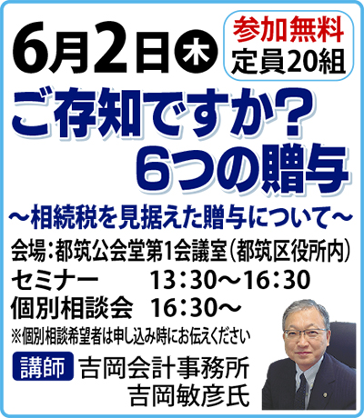 子どもの教育費や検討中の戸建住宅など、なにかと資金が必要な子育て世代必見。同セミナーでは「教育や子育て資金の一括贈与」「住宅取得資金の贈与」「相続時精算課税制度」など、知らないと損をする贈与税の非課税制度が紹介される。講師を務めるのは吉岡会計事務所の所長税理士・吉岡敏彦氏。また、同社担当者からは住宅にかかる費用や金利などの内容が講話される。「相続税は贈与税と比べて税率が低く、贈与の控除額や種類を認識しておくことや相続時精算課税制度を利用する必要がある」と吉岡氏。また、希望者を対象にセミナー終了後に個別相談会を実施する(事前予約制)。駐車場完備(有料)。