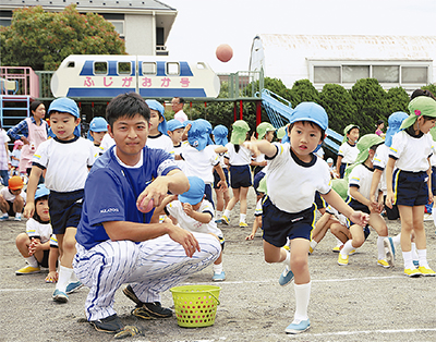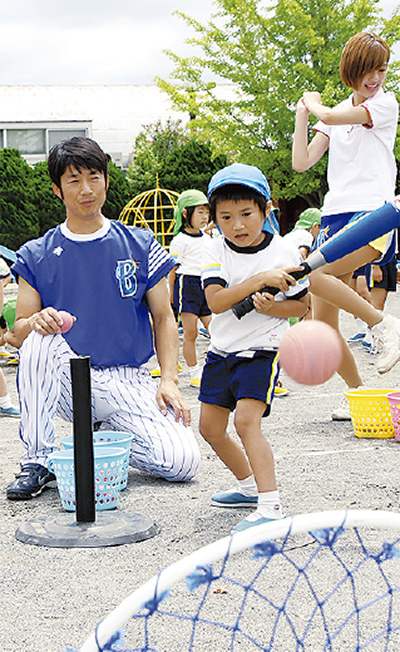 これは地域貢献として同チームが幼稚園などで実施している野球ふれあい訪問の一環。選手OBの北川利之さん、加藤政義さんが中心となり、年長園児を対象にボールを投げ、ティーの上のボールを打つ練習を行った。そのほか、園児はマスコットのDB・スターマンやサポーティングガールズユニット「diana(ディアーナ)」と一緒にダンスするなど終始楽しそうな様子だった。