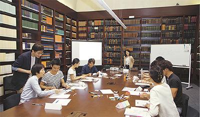 7月16日には具体的に企画を考え、実施する「桐蔭学園図書館パートナー」を養成するための講座が初めて行われ、同大学の学生4人と地域住民4人が参加した=写真。講師には図書館活用イベントを年60回実施している「墨田区ひきふね図書館パートナーズ」の北村志麻さんと小田垣宏和さんを招き、活動事例を学んだ。企画も考え、旅行雑誌等を元に語り合う「妄想旅行記」や、休日の過ごし方を学ぶ「休日力アップ講座」のほか、「モテる読書会」「お外で読書会」などのアイデアが出された。