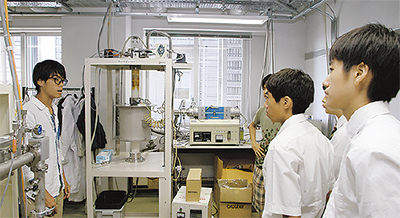 26日には生徒8人が、東京工業大学を訪問。桐蔭学園高校12期卒業生で、物質理工学院材料系の尾中晋教授から、専門である材料研究の内容や大学の概況について説明を受けた。また、当日は同学園の卒業生で、現在大学院で学んでいる学生3人も同行し、学内の研究室、食堂、電子顕微鏡室などを見て回った=写真。