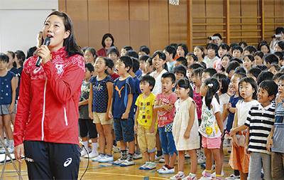 「どのくらいハードな練習をしているの」という児童からの質問には「朝8000m、午後6〜7000mを泳ぎ、ウェートトレーニングもしている」と回答。「負けて悔しい思いをするほど、強くなれる。その思いで這い上がってこられた」と言い、努力が必ず結果につながることを伝えていた。