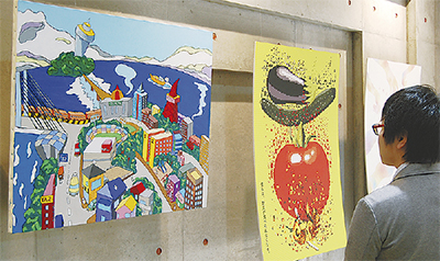 2012年、当時のホーム長からの依頼で始まった取り組みで、今回で5回目。イラストレーションや彫刻、クラフトなど各コースの学生50人以上が参加、絵画や木工作品など80点が並ぶ。館内ロビーに多くが展示されており、作品を眺めるのを日課にしている利用者もいるという。荒木剛ホーム長は「外出の機会が限られる中で、学生さんの作品を通して地域とのつながりが持てるのは大きい」と話す。