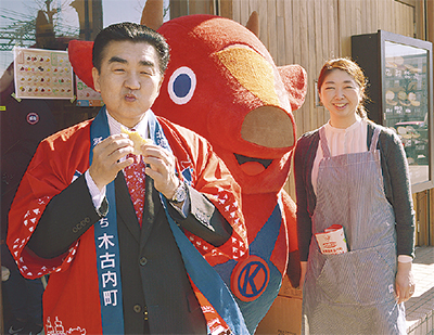 昨年末、市ケ尾町にオープンした北海道・木古内町のパン屋「コッぺん道土(ドット)」に2月14日、同町の大森伊佐緒町長が訪れ、来店客や通行人に観光PRを行った。町長は「1年前に北海道新幹線が開業し、木古内は東京と4時間で結ばれるようになった。ぜひ、木古内にも足を運んで」と話す。今後も店側と協力し、店頭にパンフレット等を置いて町をアピールしていくつもりだ。