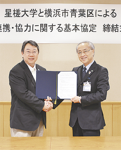 青葉区内に拠点を持つ6つの大学が、区と協定を結び、実施してきた「青葉区6大学連携事業」。協定大学の一つで、閉学が見込まれるカリタス女子短期大学との協定が昨年度末で終了したことから、区は4月19日、新たに星槎(せいさ)大学(横浜事務局/さつきが丘8の80)と協定を締結した。