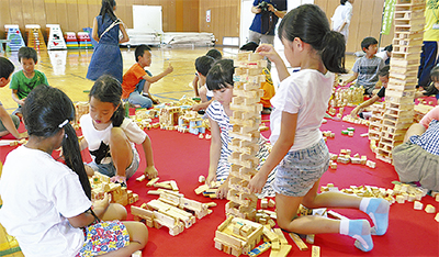 当日は同校の2年生47人が参加。体験教室などを行う学校連携団体「くろがね倶楽部」の宮原泉さんと、山崎誠政策研究所が協働で「森のつみ木広場」の授業を行った。まずは宮原さんらが、資源や食料をつくる森の役割や機能、森を守るための植林や間伐の大切さについて説明。その後、横浜市の水源林がある山梨県道志村の間伐材で作られた5千個のつみ木を使い、児童は家や橋、タワーなど自由な発想でまちを作った。