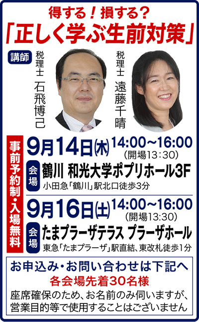 青葉区や町田市、麻生区を中心に税金・相続・経営について広くサポート、アドバイスを行っている「税理士法人アイ・ブレインズ」は9月14日(木)(鶴川)と9月16日(土)(たまプラーザ)に、地域貢献の一環として5回目の無料セミナーを開催する(要事前申込み)。