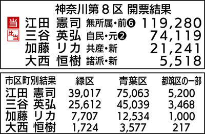 第48回衆議院議員総選挙が10月22日に投開票され、神奈川8区(緑区・青葉区・都筑区の一部)では無所属の江田憲司氏が約12万票を獲得し当選。次点だった自民党の三谷英弘氏も比例復活当選を果たした。