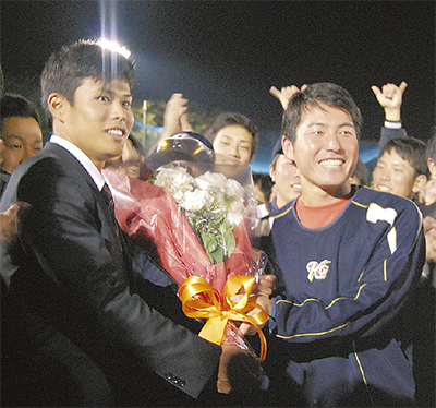 部員97人が所属する同部からプロ志望届を出したのは内野手の山崎選手と諸見里匠選手の2人。同日、都内で秋季リーグの試合があった2人は、ドラフト会議が始まってから約1時間後に中継を見守る同大の会場に到着。会議が進む中、山崎選手を楽天が指名。会場は大きく沸き上った。