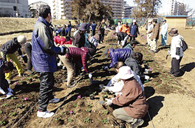 当日は、組合員のほか、ボランティア、中山中学校の生徒など約70人が参加。約3000株の芝桜が恩田川沿いに植えられた。