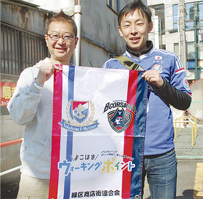 今回の取り組みの発端となったのが昨年8月。同商店街の担当者と両チームの間で、合同フラッグをつくれば、両チームのファンに仲間意識が生まれ、両チームを応援するファンが増えるのではないかという話が持ち上がり、同商店街が緑区に相談。区は、この取り組みを区民のスポーツ振興につなげたいと支援を決定。横浜市全域で進める「ウォーキングポイント」事業のロゴをフラッグに入れるなど、フラッグ制作に協力してきた。