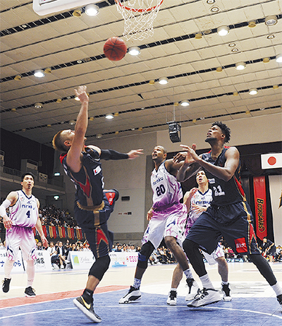 3日は2点を追う終了間際、河野誠司選手がシュートを決め土壇場で同点に。接戦を制し、青木勇人新ヘッドコーチの初陣を白星で飾った。ポイントガードの司令塔、山田謙治主将は「(参入1、2年目の)プレーオフのときみたいな盛り上がりで、会場全体の声援が後押しになった」と振り返った。4日は流れをつかめず、54―85で敗れた。