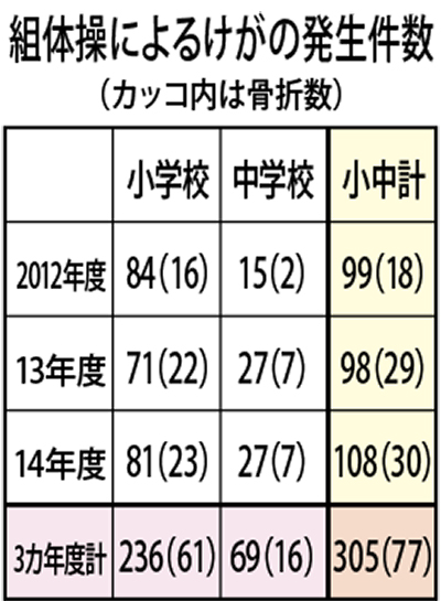 横浜市立小中学校の運動会・体育祭で行われている組体操について、2012年度から14年度までに305件のけがが発生し、そのうち77件は骨折の重傷だったことが分かった。