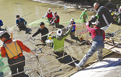 「竹山池周辺活性化推進委員会」(町田史郎会長)は12月5日、竹山団地内にある竹山池の水位を下げて、池に生息する外来種の駆除を行う「生き物捕獲大作戦」を実施した。当日は地域住民らが協力し、多数の魚を捕獲した。