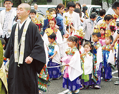天気にも恵まれた当日は恒例の「稚児行列」が催され、集まった3歳から小学2年生までの42人の子どもたちが色とりどりの稚児衣装に身をつつんで山水閣から長津田駅方面の道を行進。同寺の本堂までの行程を、同会メンバーや有志参加者の演奏する笙や篳篥(ひちりき)の音色にあわせながら練り歩いた。その後稚児が花御堂内の釈迦像に甘茶をかけて釈迦の生誕を祝わったほか、雅楽の演奏会などが催され、参加者は春のひと時を楽しんだ。