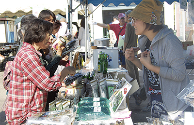 会場のテントには陸前高田市米崎町産のリンゴを使用した地ビール「リンゴエール」や岩手県立高田高校海洋システム科の生徒らが手掛けたさばの味噌煮缶などが並んだ。