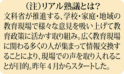 篠原中学校で、教論や行政や地元企業などが集まり、学校の在り方や防犯など諸問題を討議することで課題解決へ向けて取り組む「リアル熟議」(注)が18日、行われた。地域との連携をこれまで以上に強化するきっかけになることが期待される。