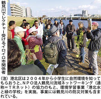 昨年11月、同市の職員や地域のリーダー8人が港北区に研修に訪れ、TRネットのメンバーや京浜河川事務所員らがレクチャーにあたった。8人は、日産スタジアムにある遊水地の見学や鶴見川の清掃や自然観察会などを通して、環境学習や防災・治水をテーマにした地域づくりの工夫を学んだ。参加者からは「どうしたら市民が河川に興味をもってもらえるか」「子どもたちが河川で学習する際の安全対策が知りたい」といった声が上がっていた。
