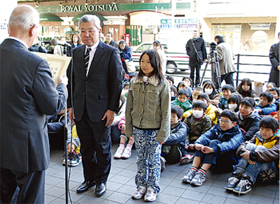 セレモニー当日は、小川浩之港北区長ほか関係者約150人が集まり、新羽小学校らに感謝状と記念品を贈呈した。