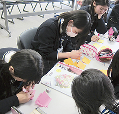 商業科2年生マーケティングコースの生徒たち11人が参加。同社がこの春から始めた、ユーモア満載の「ふせん」をウェブ上で販売する「ololo(オロロ)」という新事業に合わせて、人が笑顔になれるようなデザインの「ふせん」の開発を目指す。夏ごろの販売を予定している。