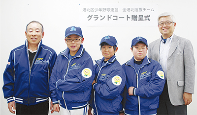 区内の大型商業施設『トレッサ横浜』(栗原郁男プレジデント)が港北区少年野球連盟(野口豊会長)にグランドコート20着を寄贈した。その授与式が1月23日、同施設で行われた。代表として佐藤護國君(新羽ホークス)、森田悠暉君(太尾パワーズ)、金田祐冴君(新羽ホークス)が参加した。同施設が同連盟主催の「トレッサ横浜杯争奪4年生大会」に協賛していることから、今回の寄贈につながった。
