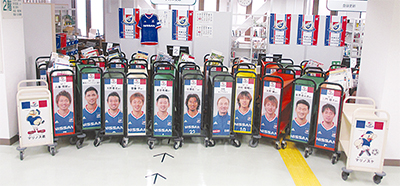 ブックトラックには選手やマリノスケの顔がラッピングされており、本を乗せながら館内を動いている=写真=。