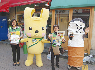 今年は5月29日(金)、午前9時から大倉山駅で、10時45分からは日吉駅で、資源循環局のキャラクター「たばこ人形」や「イーオ」が登場し、リーフレットや啓発グッズなどを1時間程度、通行人に配布する。