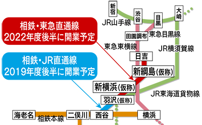 東横線・目黒線日吉駅と相鉄線西谷駅間を直通運転でつなぐ※(注)「神奈川東部方面線事業」の開業時期が遅れることが先月末にわかった。西谷駅〜羽沢駅(仮称)間の相鉄・JR直通線は当初の予定より1年遅れの2019年度後半に、羽沢駅〜日吉駅間の相鉄・東急直通線は3年半ほど遅れ、22年度後半に延期になる予定だ。新駅設置のため、大規模工事が進んでいる新横浜と綱島地区の住民からは困惑する声が上がっている。