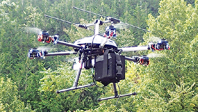 野生動物保護管理事務所(東京都)と共同開発しているこのドローン型ロボット。麻酔銃で捕らえたサルにGPS発信器を搭載した首輪を装着し、そこから発信される電波を、上空を一定時間旋回するように設定されたドローンが受信して位置を特定する。群れを成して移動をするサルの習性を生かして、上空から音や光で威嚇をしながら、生息地の山まで誘導するというものだ。