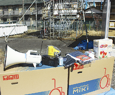 大豆戸町にある防災備蓄庫には、備蓄品としてアルミブランケットやトイレパック、ランタン、ラジオ、水缶、ビスケットなどが完備されている。誘導訓練の後にはこれらの紹介も行われた。小野崎信之副区長は「事業所や団体ごとの訓練・備蓄が大切。”自助・共助”を意識し、ともに災害に備えていきたい」と話した。