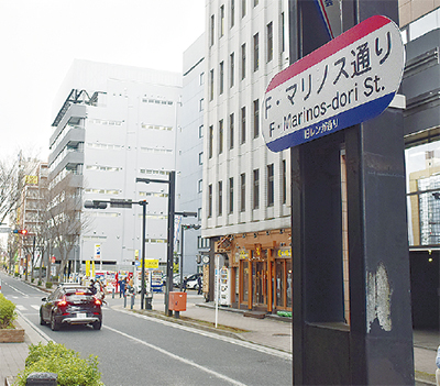新横浜駅から日産スタジアムに向う延長約300mの道路が、2月25日から「F・マリノス通り」に愛称変更された。道路を管理する新横浜町内会金子清隆会長は「マリノスを”おらが街のチーム”として力強く応援したいという気持ちで実現しました」と話す。