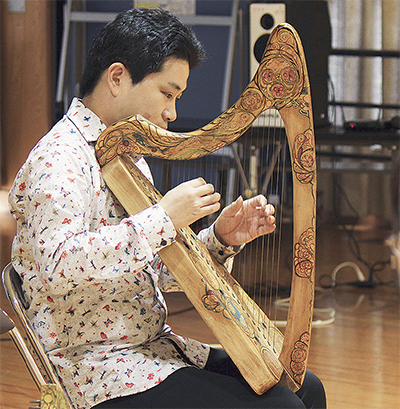 日本・アイルランド外交関係樹立60周年を記念し、川崎市国際交流センターではワークショップ「アイルランドの音楽とダンス」を開催中。9月9日に行われた第一回目では、アイルランド・ダンスのダンサーである寺町靖子さんとともに、日吉在住のアイリッシュ・ハープ奏者、寺本圭佑さん=写真=が講師を務めた。