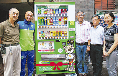 綱島出身で、がんと闘いながら日本フットサルリーグ(Fリーグ)でプレーを続ける久光重貴さん(36=湘南ベルマーレ)。このほど久光さんによる「フットサルリボン活動」を支援する自動販売機が、綱島商店街事務所ビル入り口に設置された。綱島商店街協同組合(中森伸明理事長)の協力で実現したもので、今回が初の設置。