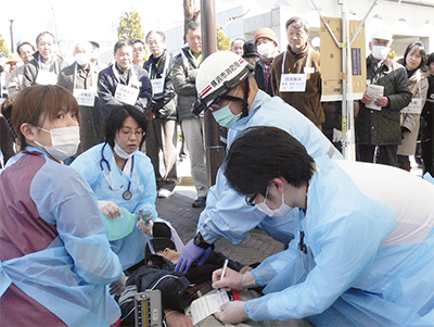 東日本大震災から1年を経ようとしている今回は、震度7の地震が起こり、多数の負傷者が発生した、という状況下を想定。訓練冒頭、水野会長は「災害時の医療連携を体感してもらいたい」とあいさつ。続いて中村香織区長も「地域の中で助け合いが出来る関係を築くのが大切」などと話した。