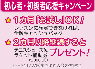 まず注目は、1カ月の「お試し期間」。この期間中は、もしレッスンに満足できなければ、全額キャッシュバックしてもらえるという内容。「始めの一歩」を後押ししてくれる。また、期間中はラケットやシューズを無料でレンタルできるので手ぶらで行けるのも嬉しい。12月27日(木)までに入会した人で2カ月以降続ける場合は、テニス専用のシューズとラケット補助券5千円のプレゼントも。